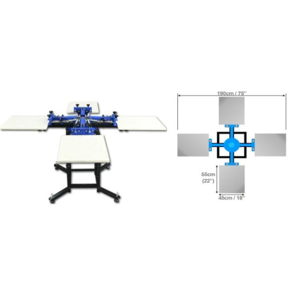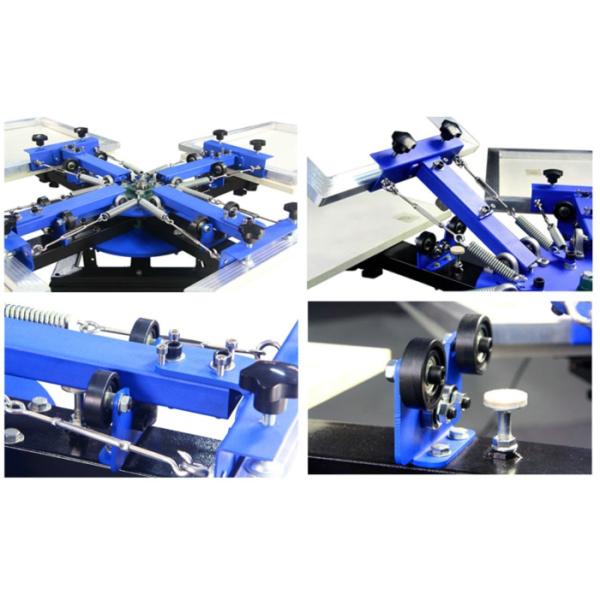 4 Color 4 Station Screen Press is the only the one and only double-rotary printing machine which adopts assembled instruction but still can guarantee the accuracy color registers of four colors in four stations. It has kept the common functions of the similar machines, such as double rotary of pallet layer and screen layer, high pulling intensity of double springs, height of pallet putting up and down, screen adjusted in all round, left and right location of screen frame support arm, etc. What's more, it has some special functions with human nature, overcoming the shortcomings of the traditional machines, which brings more relaxed, accurate but higher efficient printing effect. So it's the highest cost-performance screen printing machine during the screen presses with the same prices.